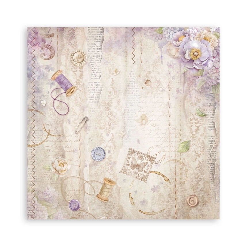 Set de 22 papeles de scrap a una cara, con preciosas ilustraciones de perritos, mariposas, flores en tonos lila y estilo vintage diseñada por Emilia Sieradzan para Stamperia.