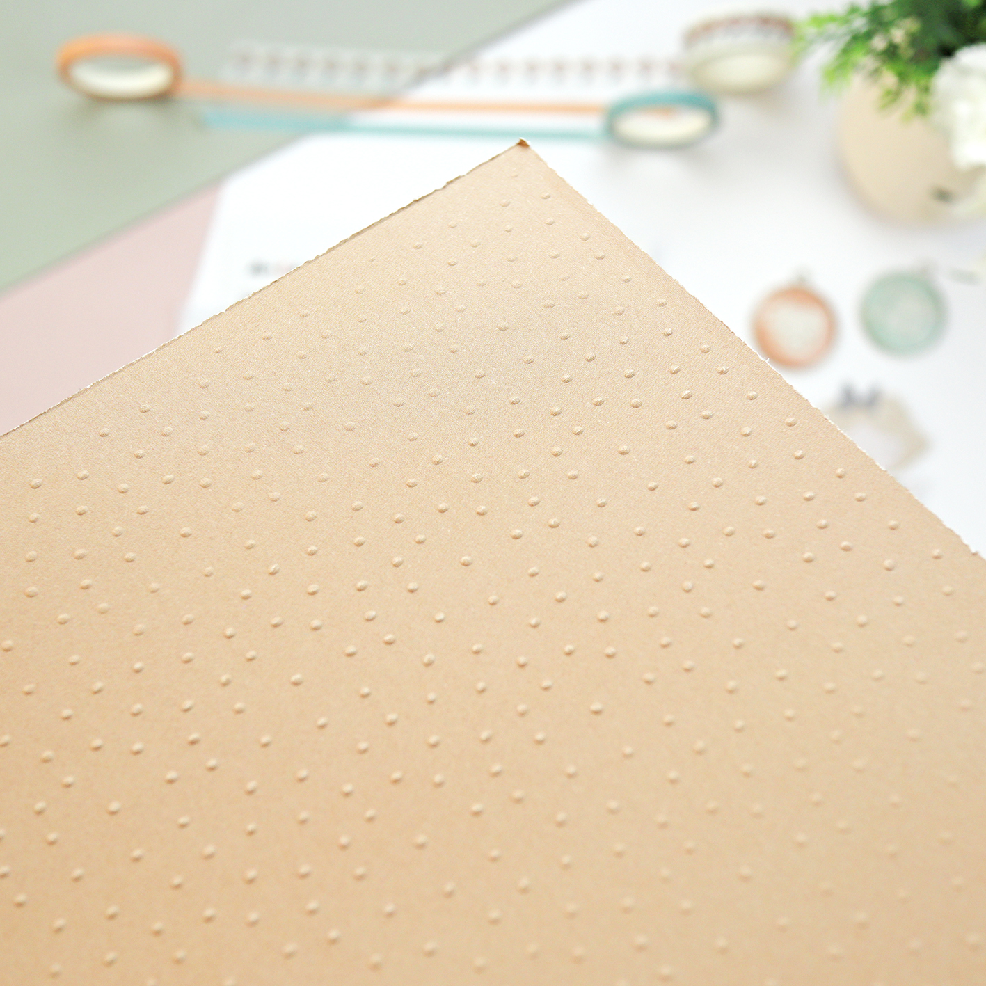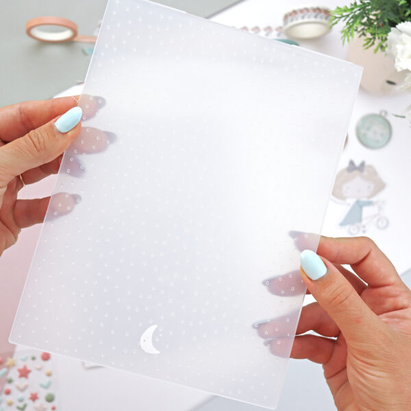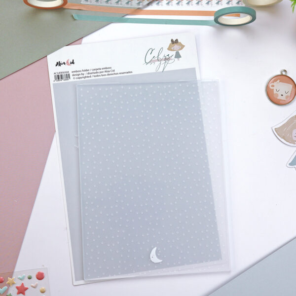 Carpeta para embossing o repujado en seco con topitos de la colección CeliAlice de Alua Cid.