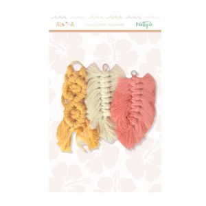 Set de 3 modelos de colgantes realizados en macramé, perteneciente a la colección Aloha diseñada por Wilma Rodriguez (@atiasroom) para Mintopia.
