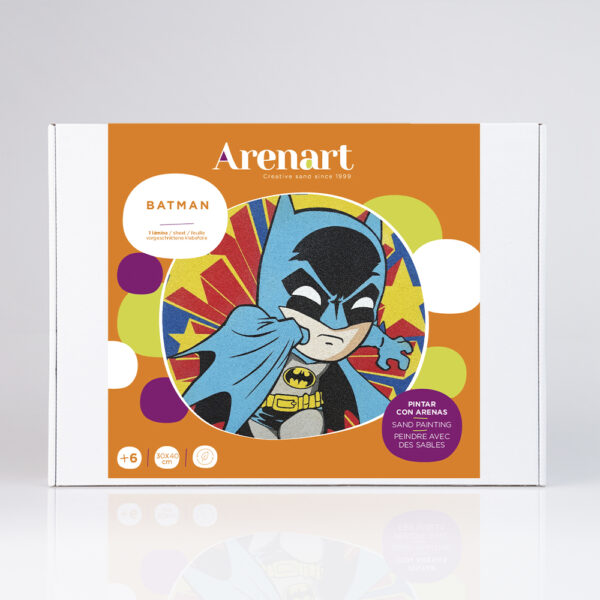- 1 lámina con el superhéroe Batman de cartulina adhesiva, dibujada y precortada para pintar con arenas de colores 30×40 cm.
