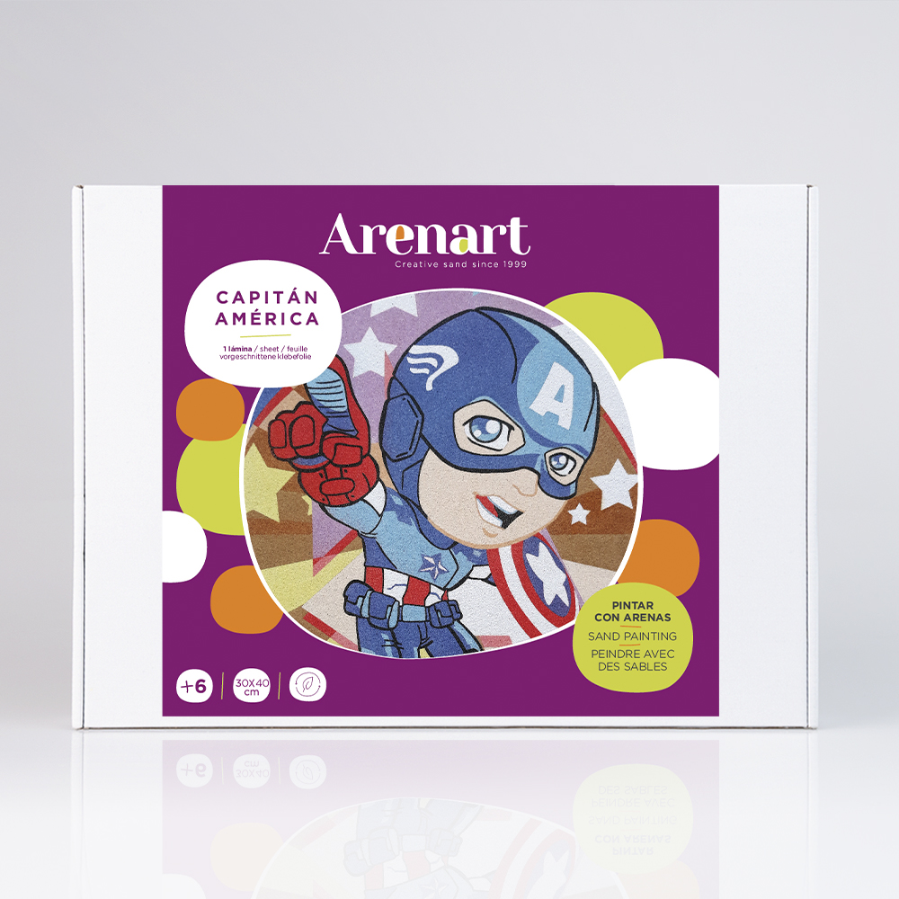 - 1 lámina con el superhéroe Capitán América de cartulina adhesiva, dibujada y precortada para pintar con arenas de colores 30×40 cm.