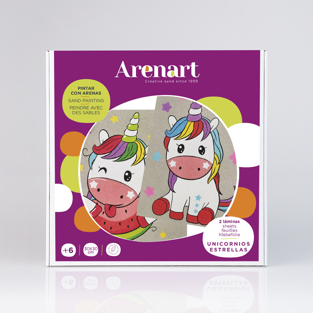 - 2 láminas con unos graciosos unicornios de cartulina adhesiva, dibujada y precortada para pintar con arenas de colores 30×30 cm.