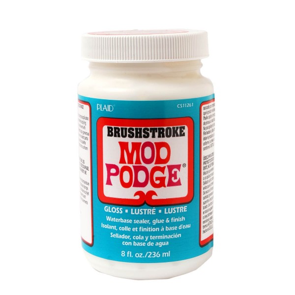 Barniz cola multiusos con acabado brillante de la línea Brushstroker Mod Podge de la marca Plaid. De color blanco, al secar queda totalmente transparente.