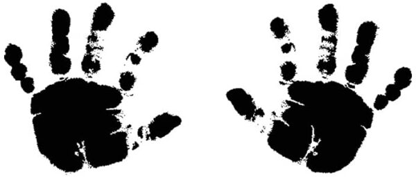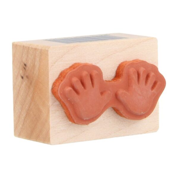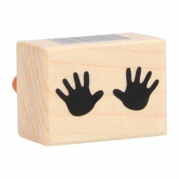 Sello de caucho montado en madera de la marca Artemio con la huella de 2 manos de un tamaño aproximado de 2.6cm x 5.7cm