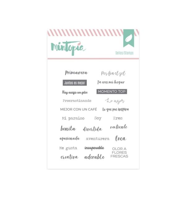 Set de 24 sellos con frases y palabras ideales para documentar tus proyectos, de la marca Mintopia, fabricados en fotopolímero de alta calidad.