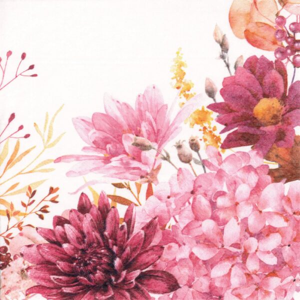 Servilleta para decoupage, impresa con unas preciosas flores en tonos rosas.