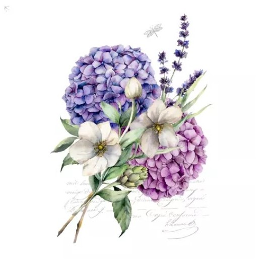 Servilleta para decoupage, impresa con un ramo de hortensias y flores blancas.