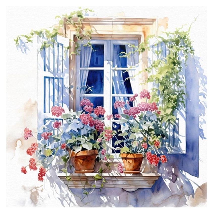 Servilleta para decoupage, impresa con una ventana con macetas de flores.